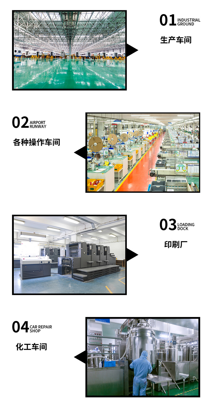 電器、電子、機械、食品、醫藥、化工、煙草、飲料、紡織、服裝、家具、塑料、文體用品等制造工廠的車間水泥或水磨石地面。